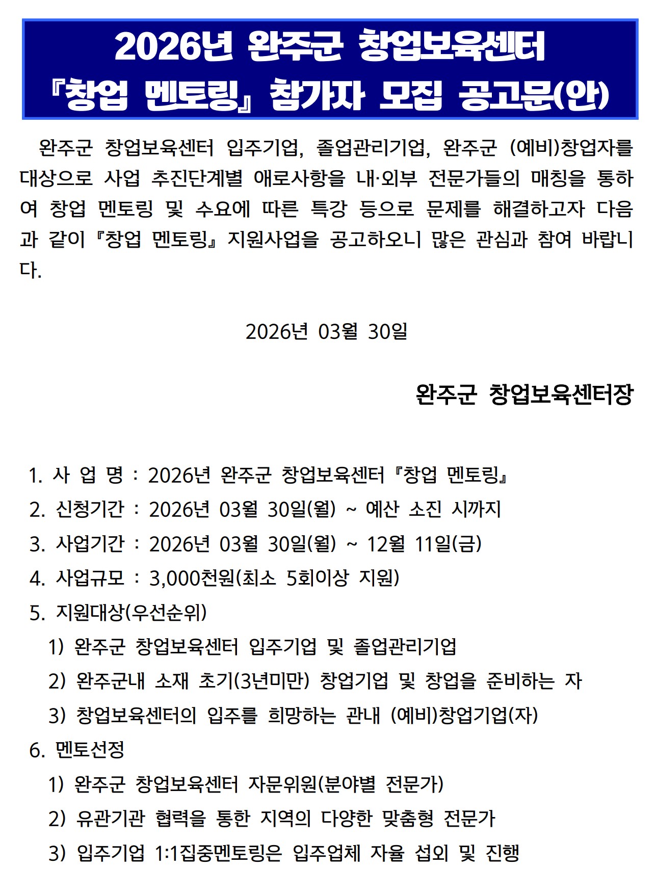 | 제 목 : | [공고] 2026년 완주군 창업보육센터 창업 멘토링 참가자 모집 공고문 | ||