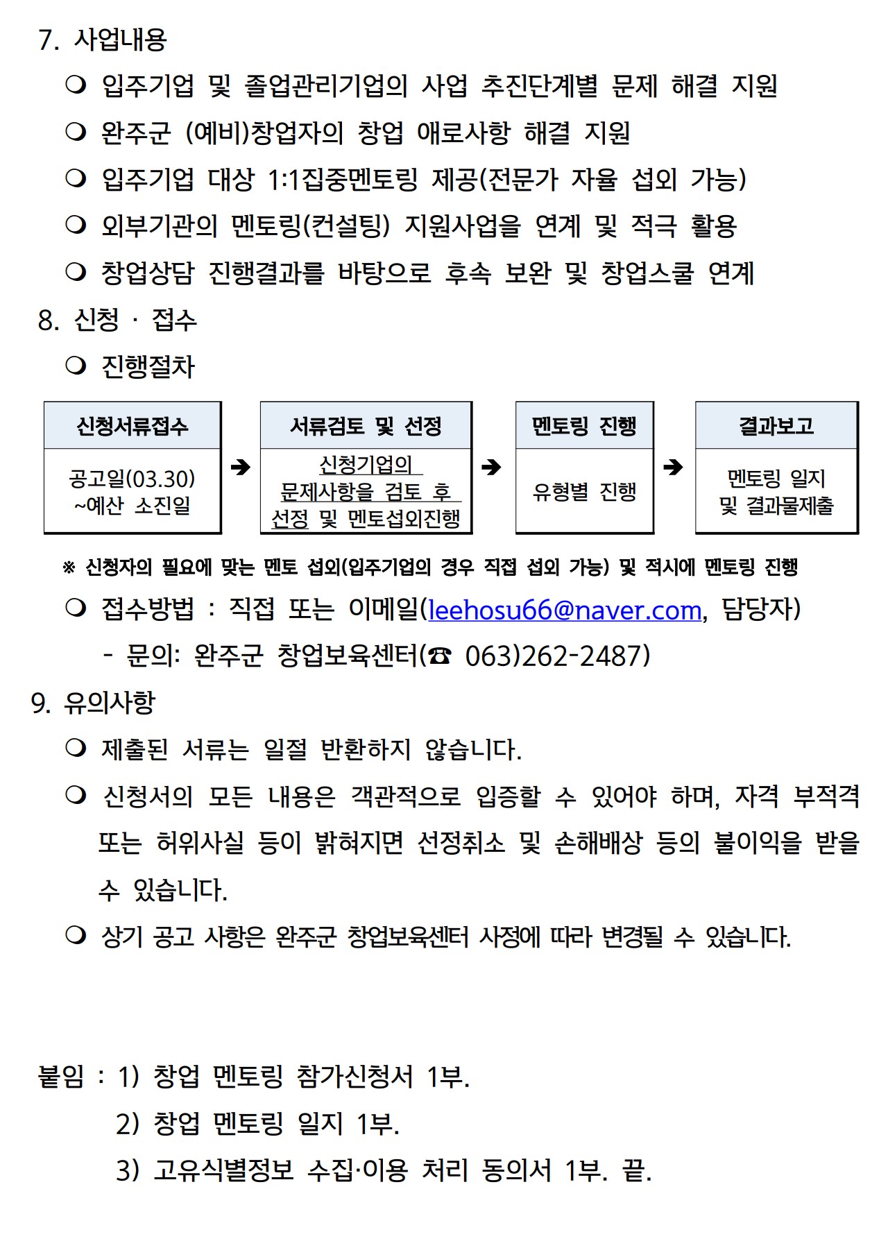 | 02.2026년완주군창업보육센터창업멘토링공고문.pdf (43 kb) 03.2026년완주군창업보육센터창업멘토링서식.hwp (210 kb) |